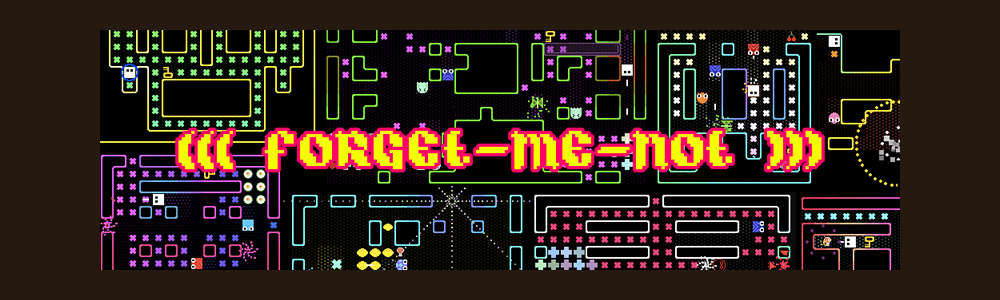 Forget-Me-Not is a tiny little arcade game for one or two players. Mazes + monsters + shooting. You have to run around the infinite, ever changing corridors of the NEON DUNJUN, gathering flowers and shooting everything. ZAP! Grab the key to the next floor, and try not to let monsters take it off you. Once you've picked all the flowers, the doorway shall appear...An important skill you should learn: Grinding the walls. Grind for a bit to charge yourself up for super enemy squishing powers and boosted speed. Don't let your charge build too high though or... '`*# KABOOM! #*'` Collect the longest unbroken chains of flowers you can for lots of combo points. Also collect fruit. Heaps and heaps of it. You'll get an extra life for each 100 pieces you grab. It's good for you.